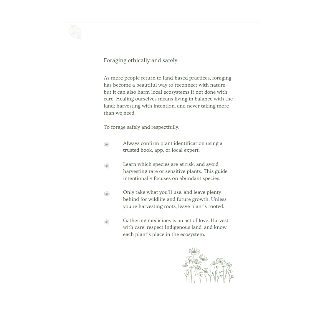 A pocket-sized foraging guide with simple remedies and respectful harvesting tips — focused on abundant plants across Canada. Made for the field, bound with care.